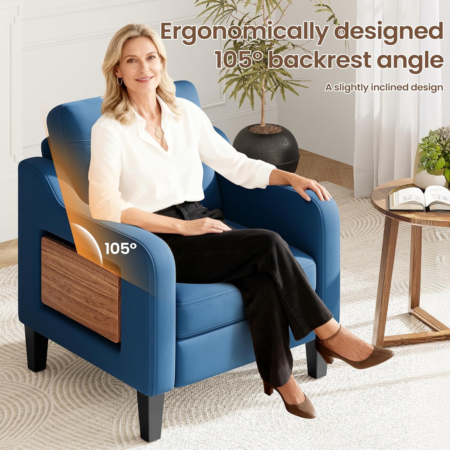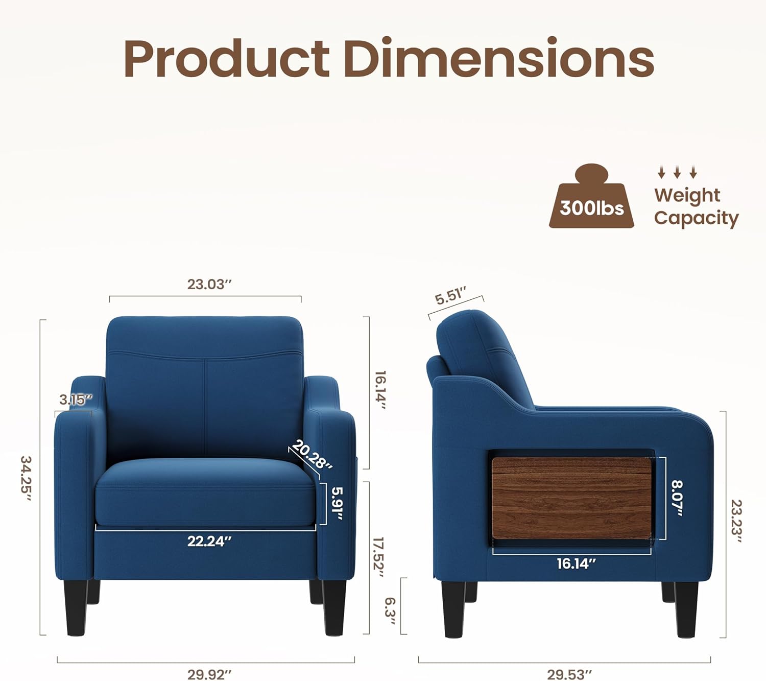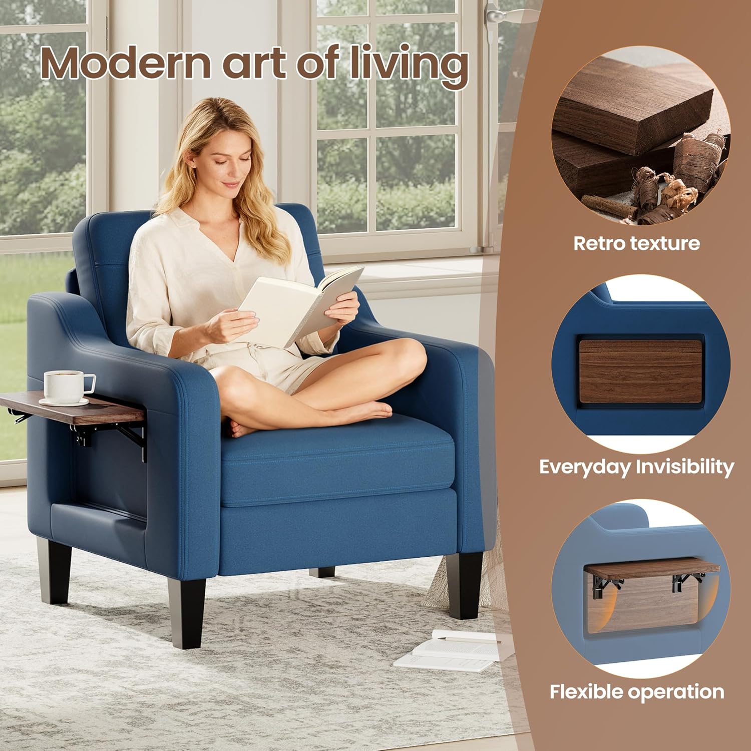 Accent Chair for Living Room Modern Linen Upholstered Armchair Side Wooden Fabric Sofa Chair with Foldable Table 2 Side Pockets Comfy Reading Chair for Bedroom