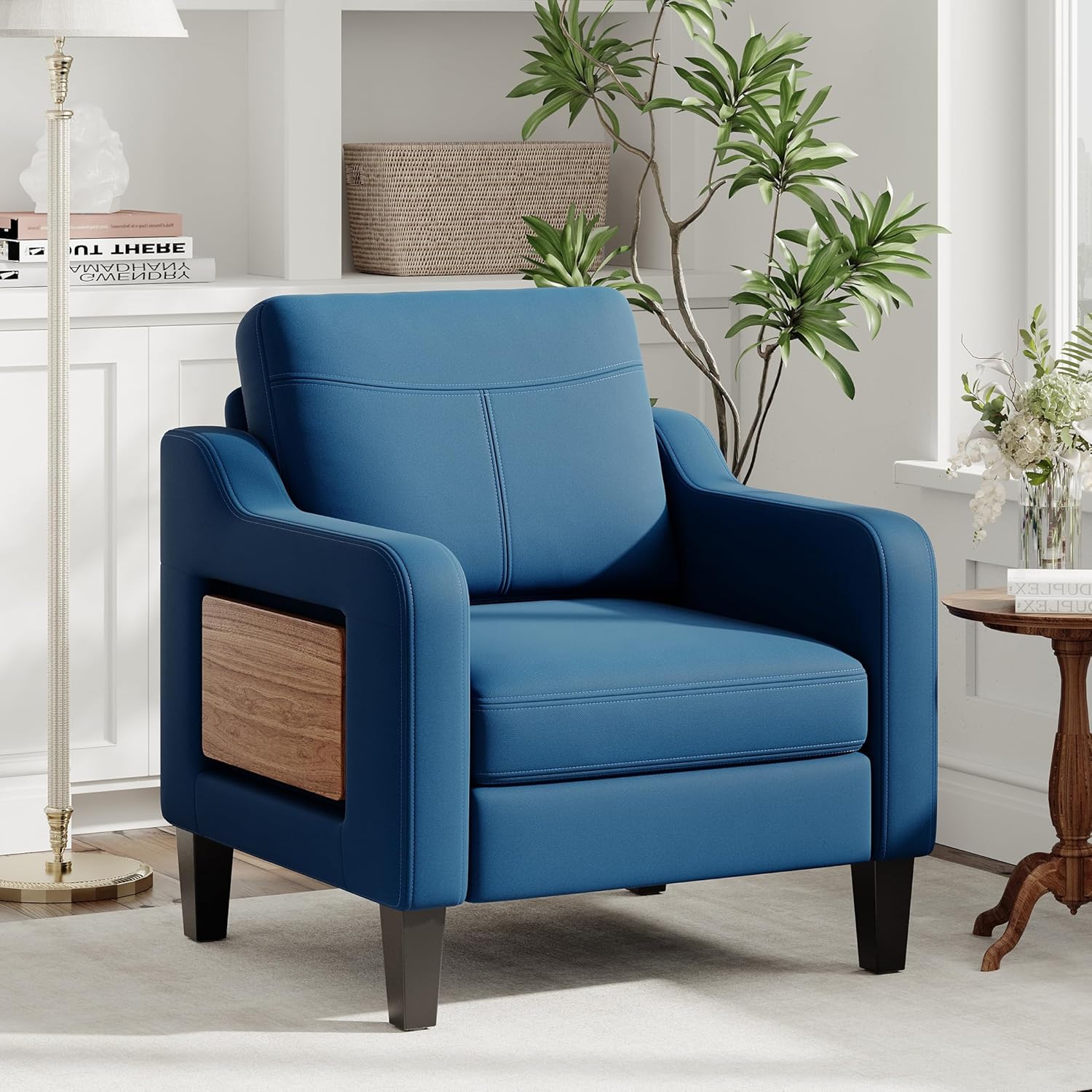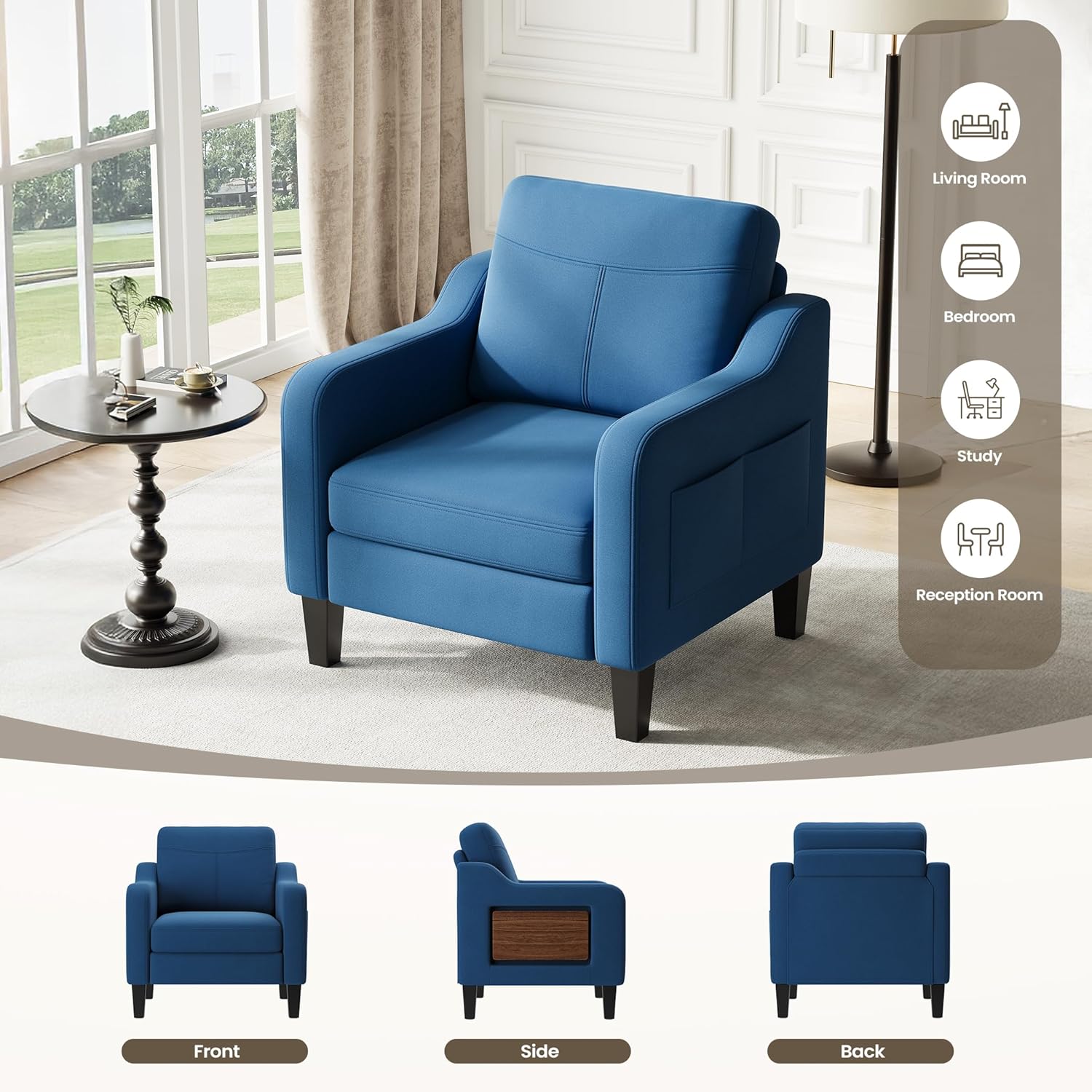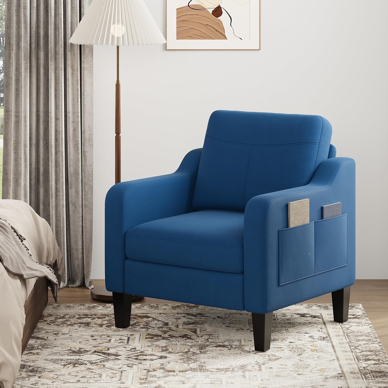 Accent Chair for Living Room Modern Linen Upholstered Armchair Side Wooden Fabric Sofa Chair with Foldable Table 2 Side Pockets Comfy Reading Chair for Bedroom