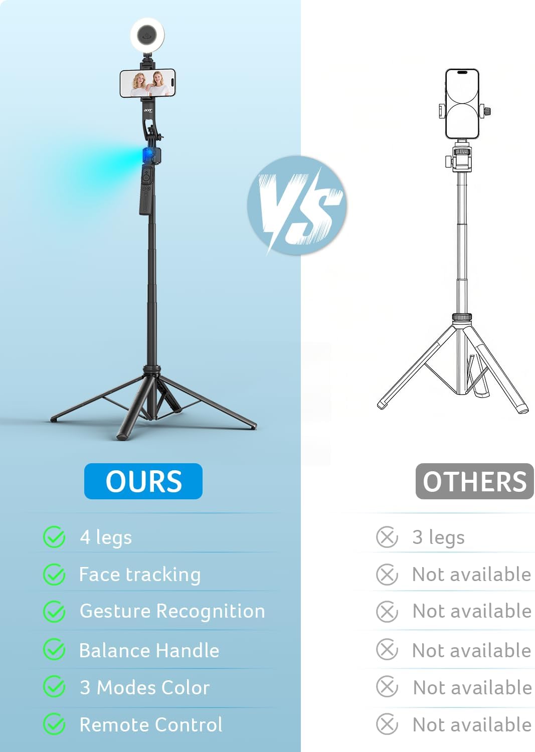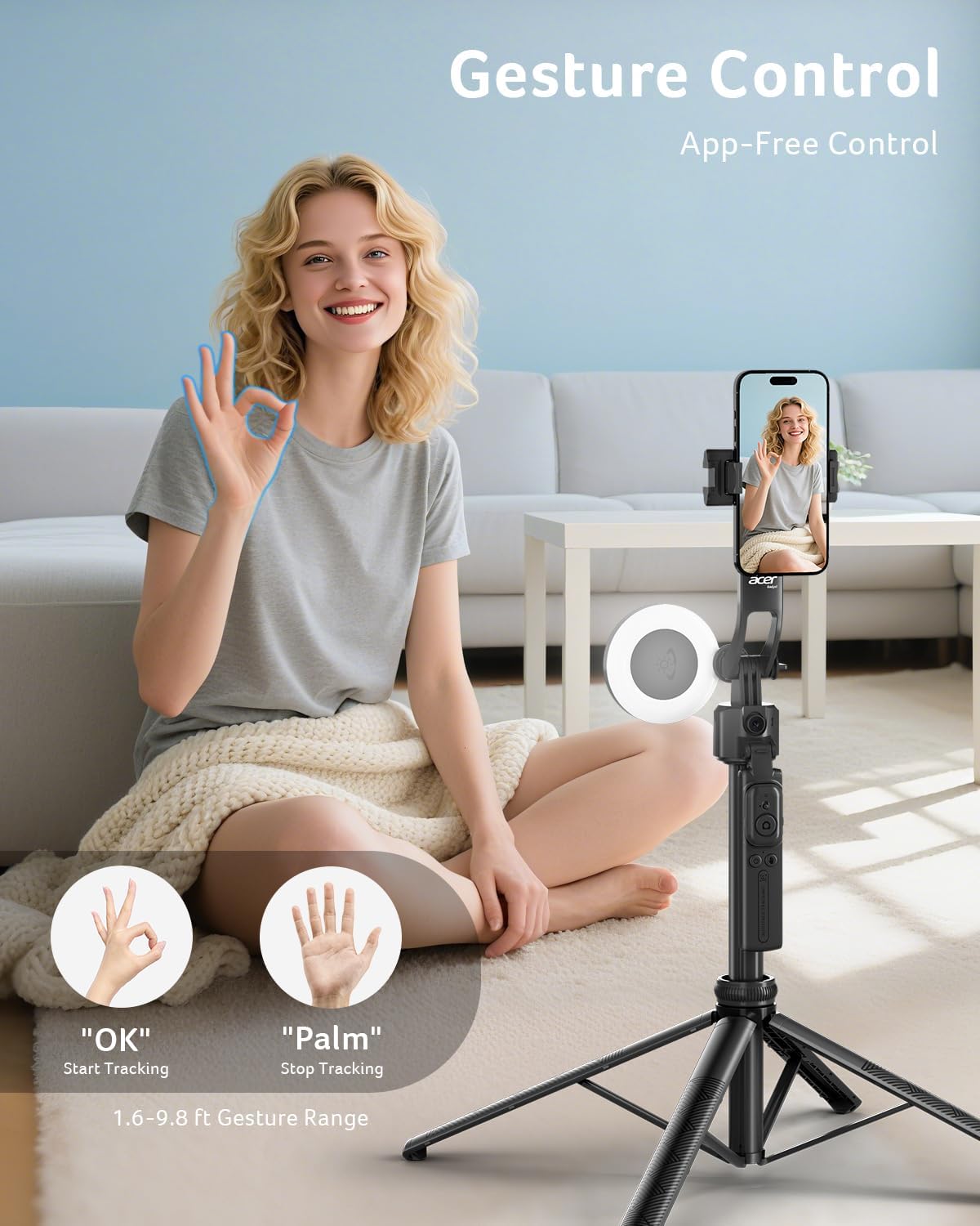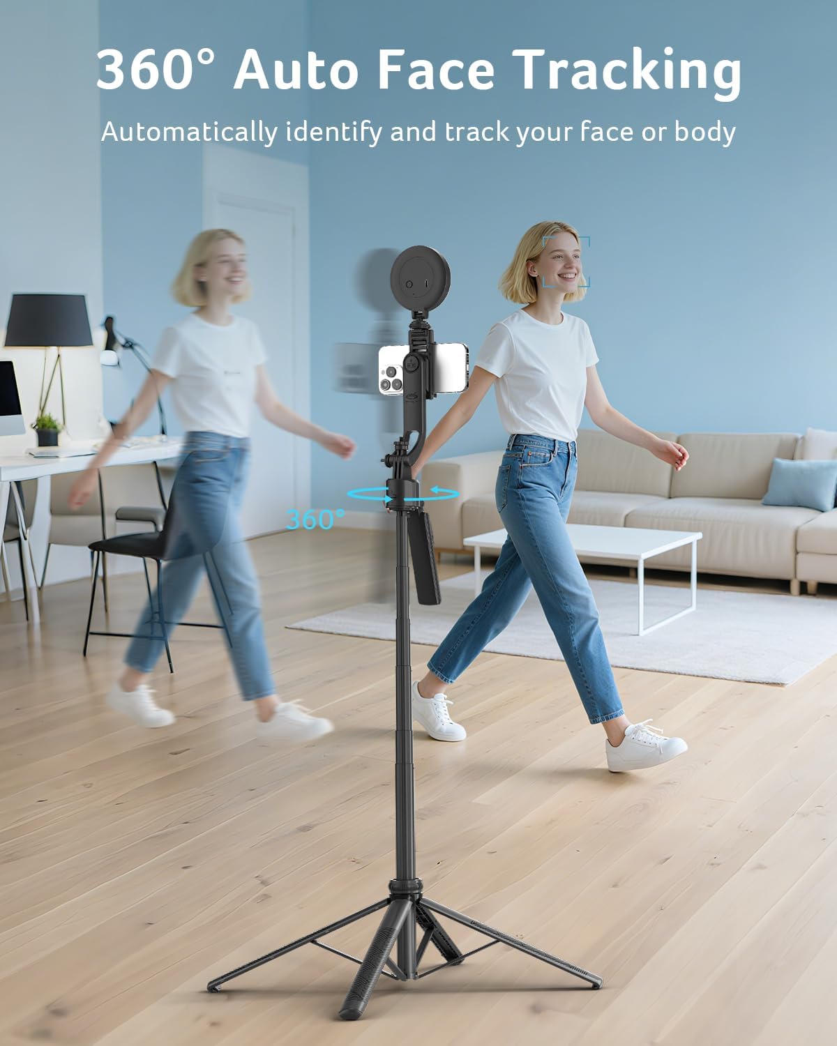 You do not need an app for this auto tracking tripod. It recognizes and follows your face or body instantly to keep you centered in the frame. It adjusts the shooting angle automatically making it a perfect tool for content creators who record video or live stream.