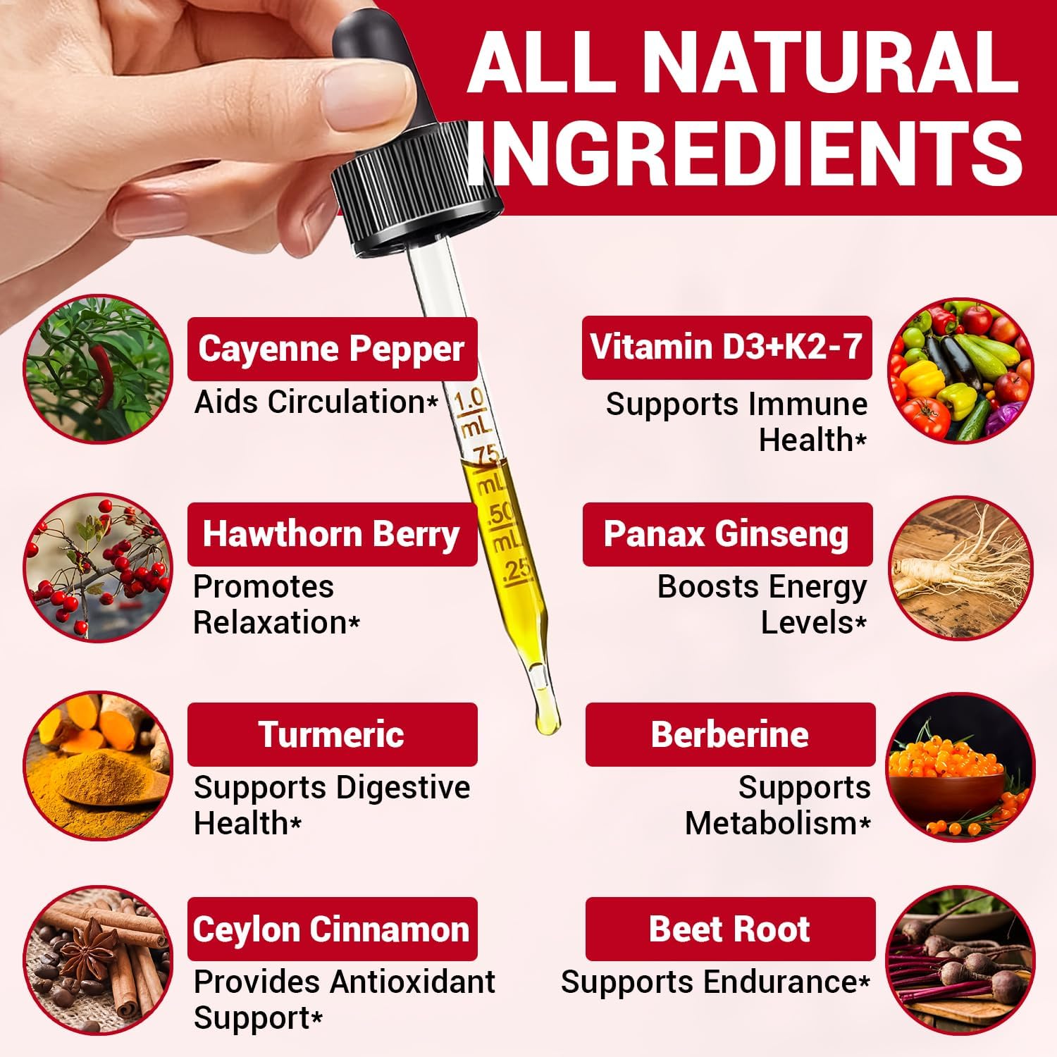 Cayenne Pepper Liquid Drops with Vitamin D3 & K2, Hawthorn, Beet Root, Turmeric, Panax Ginseng, Berberine & Ceylon Cinnamon - Quality Supplement for Daily Wellness - 2 fl oz (60mL)