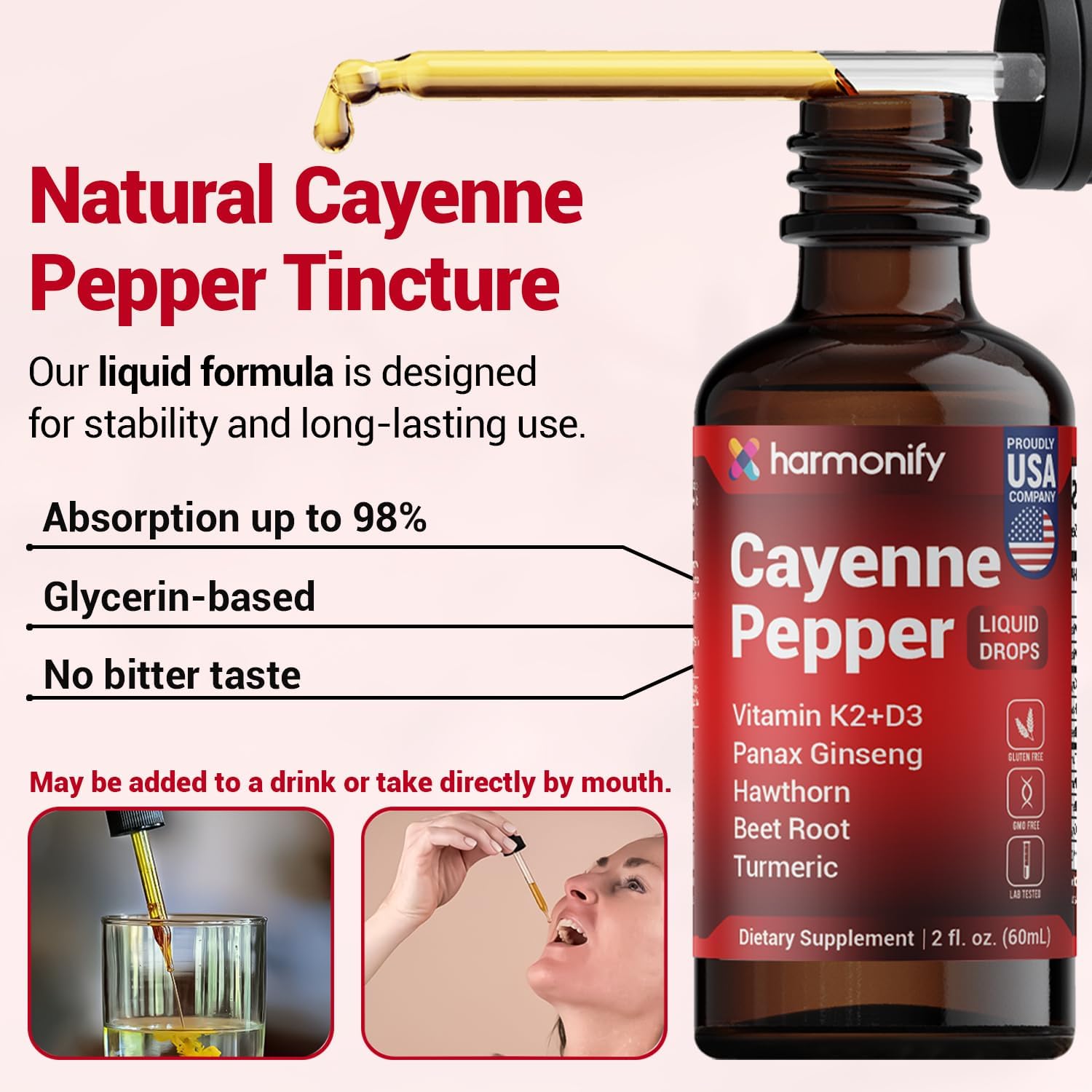 HARMONIFY Cayenne Pepper Liquid Drops provide a potent blend of active ingredients per serving, including 200mg Cayenne and 100mg Hawthorn. The formula is further enhanced with 100mg Beet, 50mg each of Turmeric, Panax Ginseng, Berberine HCl, and Ceylon Cinnamon, along with essential Vitamin D3 (60mcg) and Vitamin K2 (100mcg).