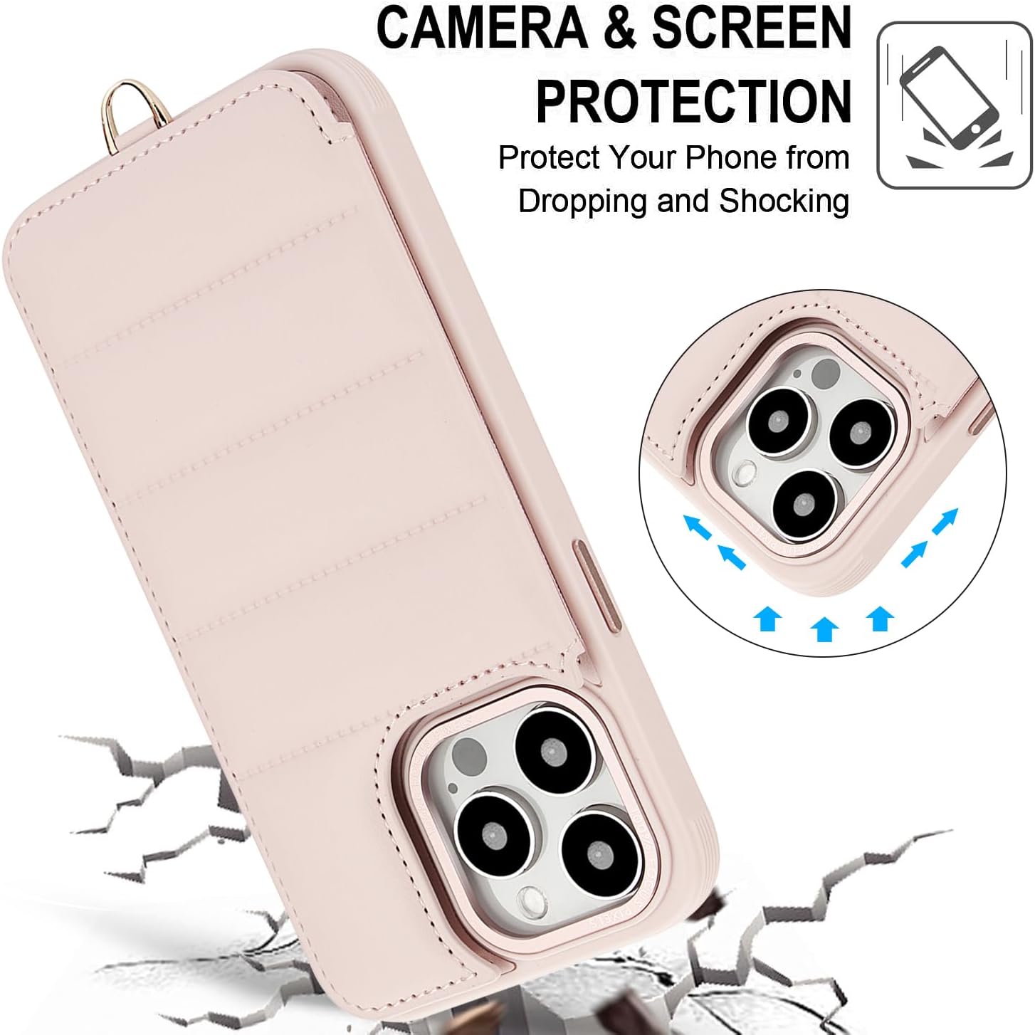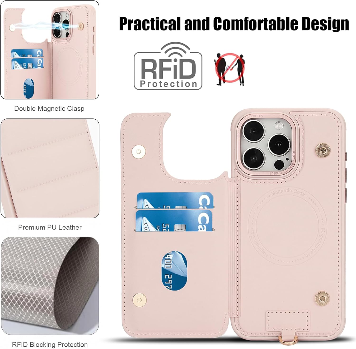 Crossbody Wallet Case for iPhone 16 Pro Max with Strap,RFID Blocking Leather Flip Case for Women with Card Holder,Magnetic Purse Shockproof Cover with Kickstand,Lanyard,Pale Pink