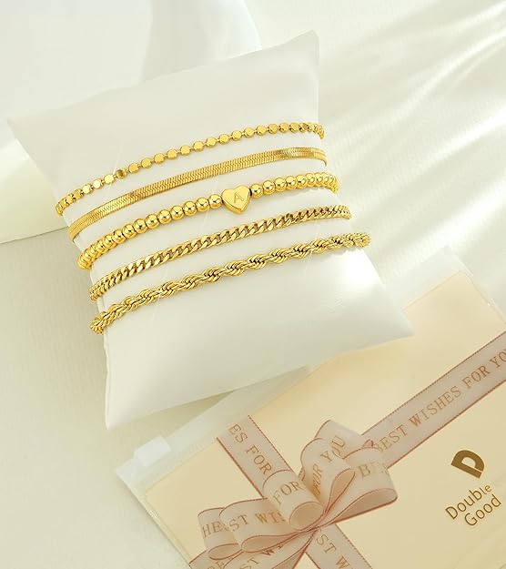 doubgood Gold Bracelets for Women Waterproof Stackable Heart Initial Charm Bracelets Set A-Z Letter 14K Gold Plated Adjustable Chain Link Stack Jewelry Gifts for Women Mother's Day