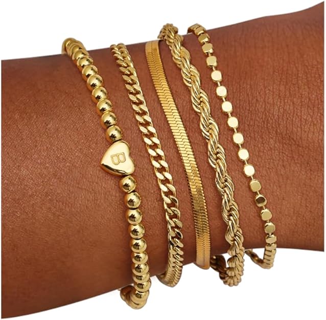 This dainty stackable bracelet set features five different chains including herringbone rope Cuban and flat bead styles. It also includes a fourteen karat gold plated beaded bracelet with a heart shaped letter charm. Each piece can be worn separately as an elegant gold bracelet or layered together to create a chic stack.