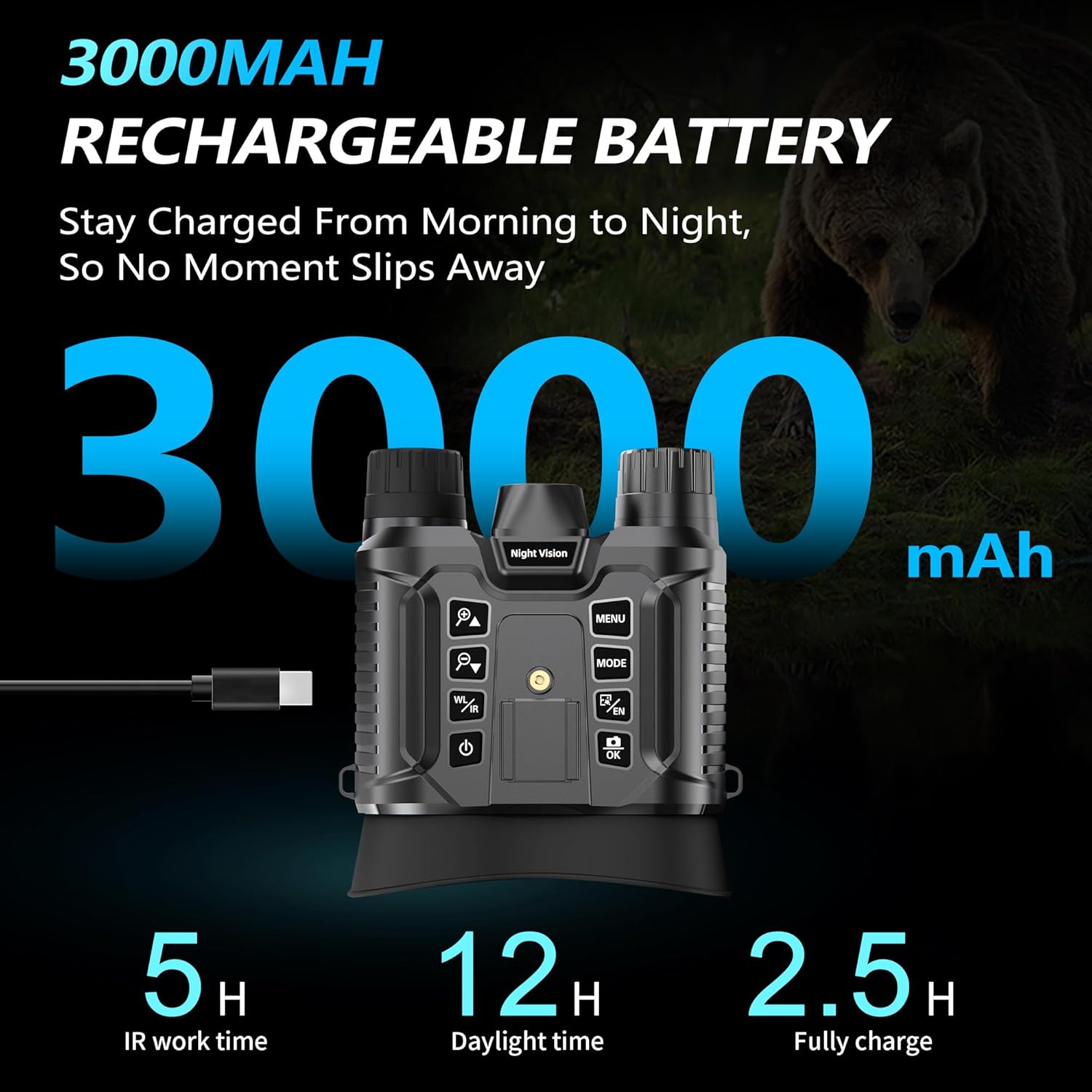 The Dsoon night vision system is powered by a 3000mAh lithium battery designed for long-lasting field use. It supports Type-C fast charging, reaching a full charge in just 2.5 hours. You can expect up to 12 hours of continuous operation in daytime mode or between 3 and 5 hours of performance when using the infrared settings in total darkness.