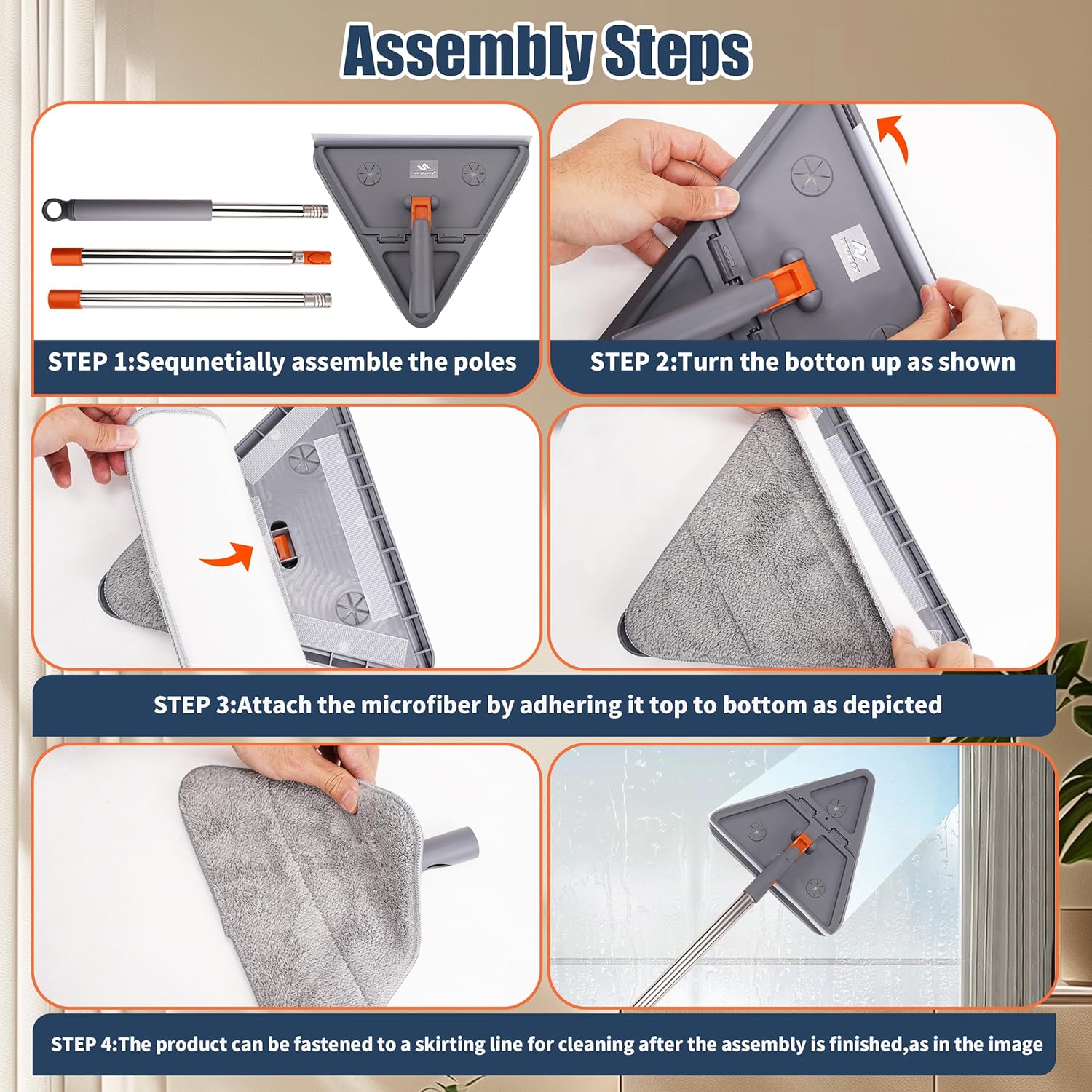 Featuring a 360-degree rotating head, this triangle mop is ideal for maneuvering into corners and tight spaces. The mop also includes a flipped 90-degree panel, making it perfect for cleaning baseboards with ease.
