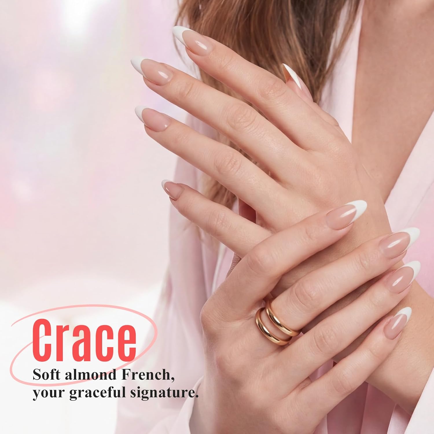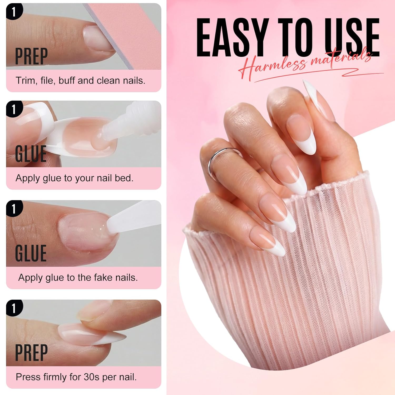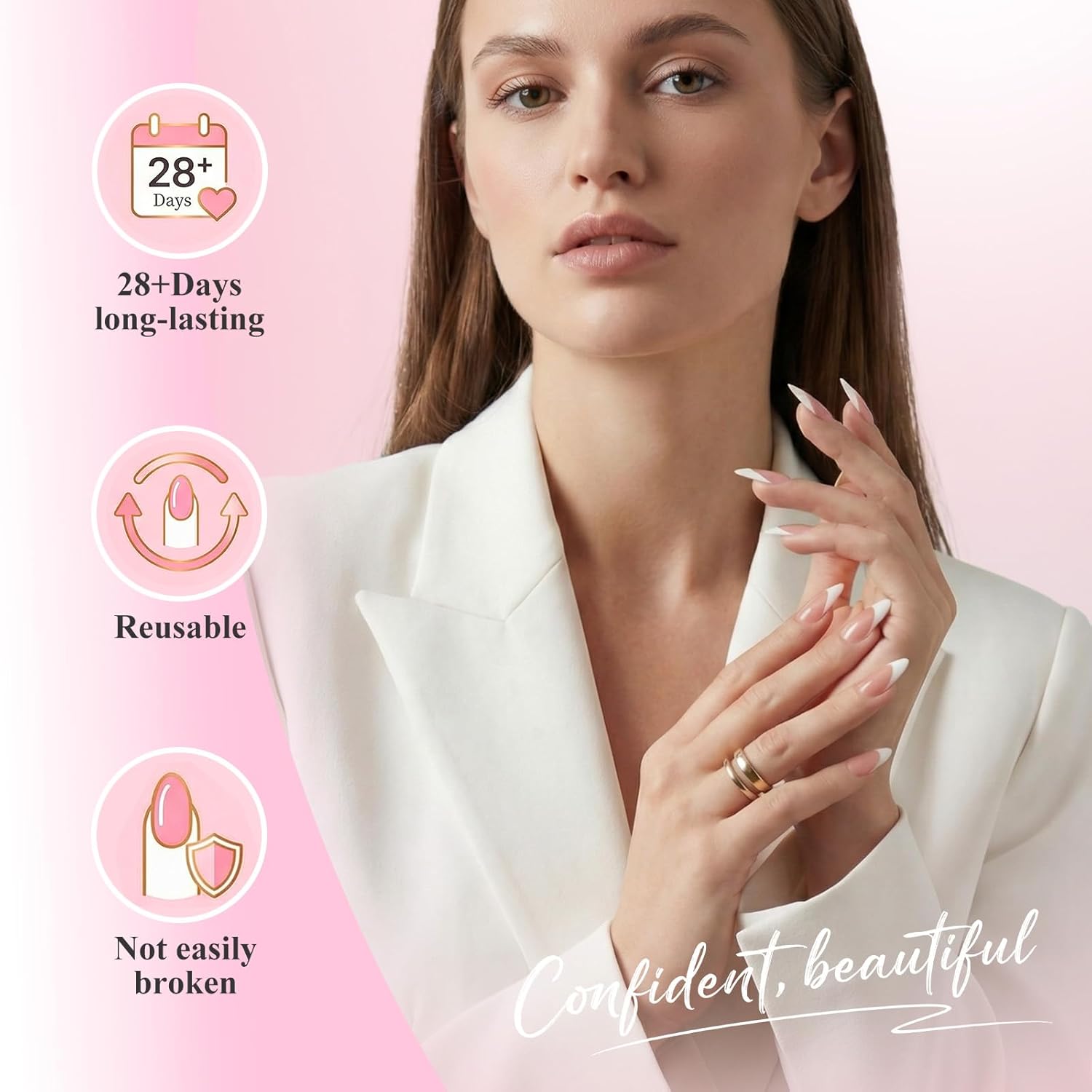 The timeless medium almond french tip nails are your go to for any event whether professional elegant or casual. Choose the strong nail glue for a 21 to 28 day salon perfect hold ideal for weddings or long lasting wear. Or opt for the gentle adhesive tabs for a flexible 4 to 7 day manicure that removes easily without damage. Whichever you choose you can enjoy a chip resistant beautiful finish.