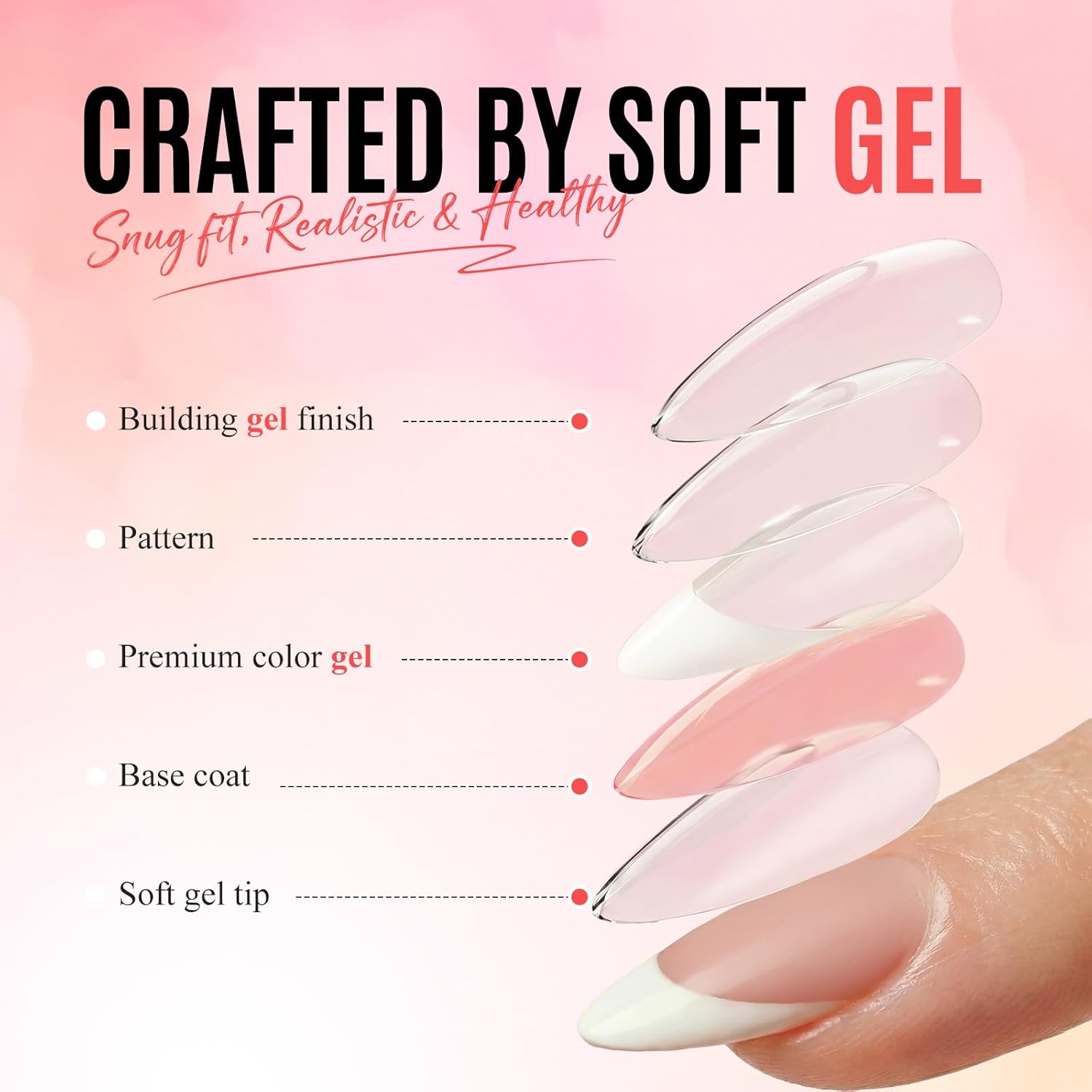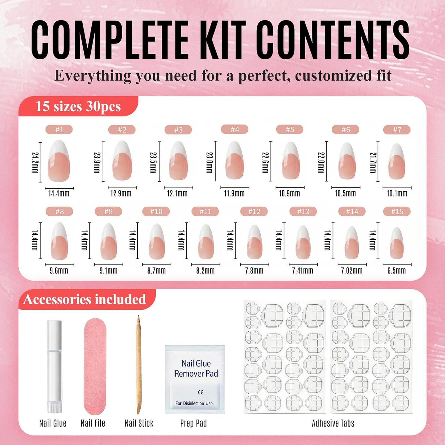 French Tip Press on Nails Medium Almond, Soft Gel Glossy Fake Nails Press on with Glue, 30Pcs Reusable Stick on Nails in 15 Sizes, Salon Quality False Nails for Women Spring Vacation DIY Gift