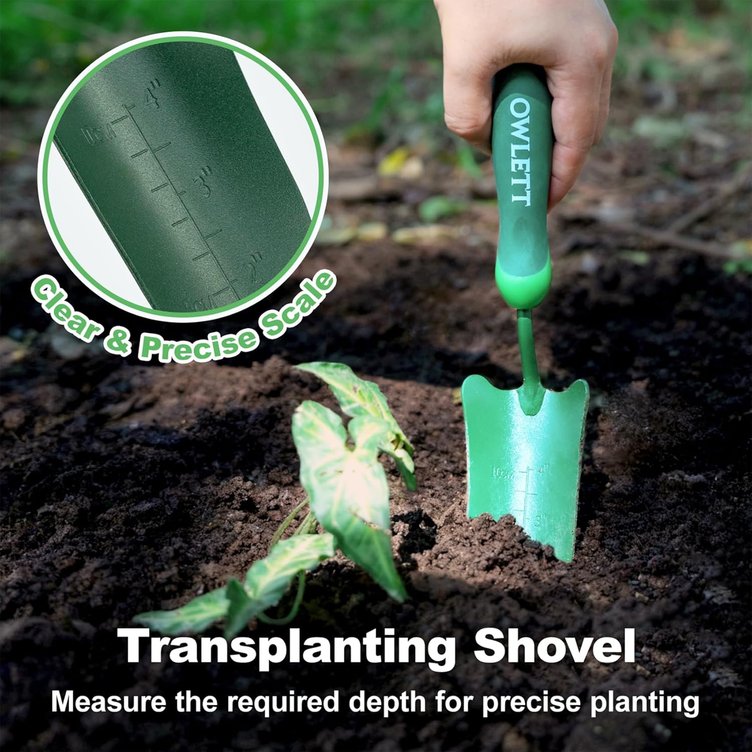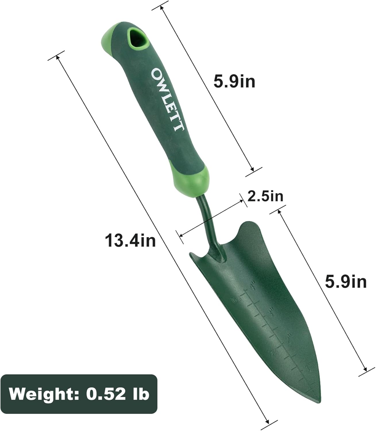 The Owlett Measuring Garden Trowel is a complete gardening companion. With its wide, sturdy blade, you can safely transplant plants. The scale markings on the blade allow for accurate digging of planting holes, and the concave design makes it easy to scoop soil into containers for repotting. It is also useful for loosening soil and mixing in compost, fertilizer, or other nutrients. A hanging hole is included for easy storage.