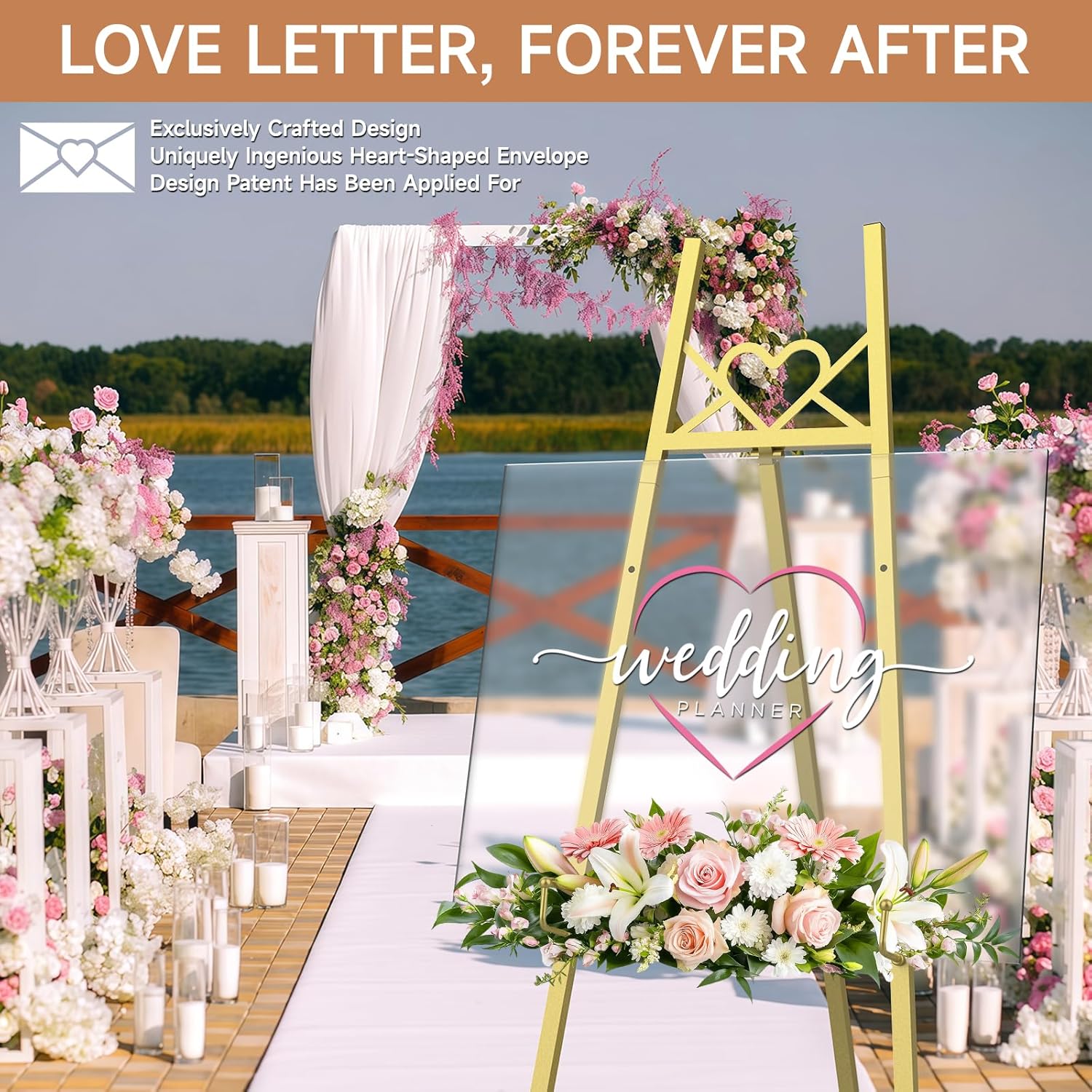 Featuring an exclusive heart-sealed envelope fusion, this design symbolizes the wedding as the beautiful starting point of a lifelong journey together. This gold easel stand serves as a timeless witness to your unique love story, presenting your wedding signage as an eternal promise of commitment.