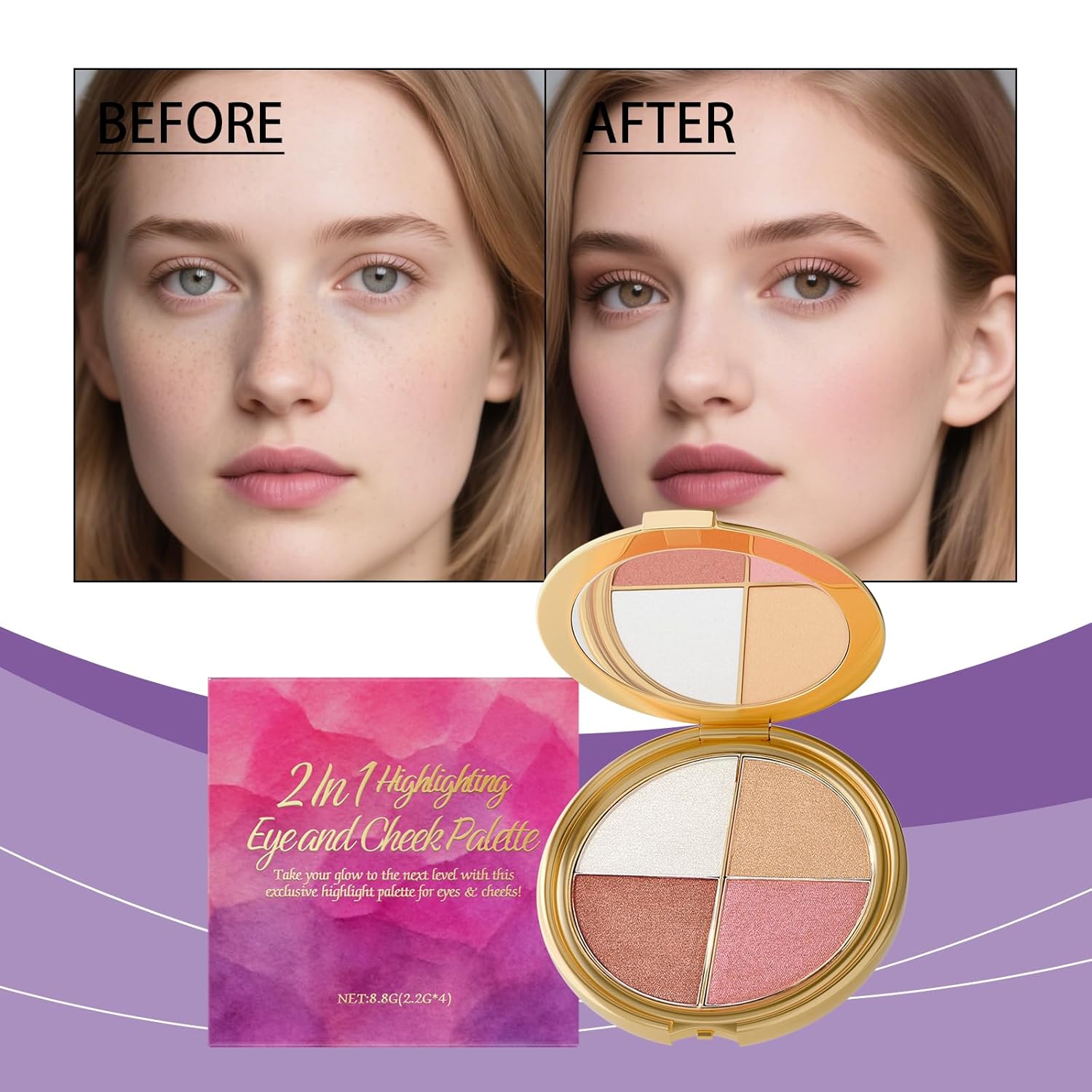 The slim and lightweight packaging fits easily into handbags or makeup pouches. This makes the highlight eyeshadow and blush palette very convenient for on the go use and travel.