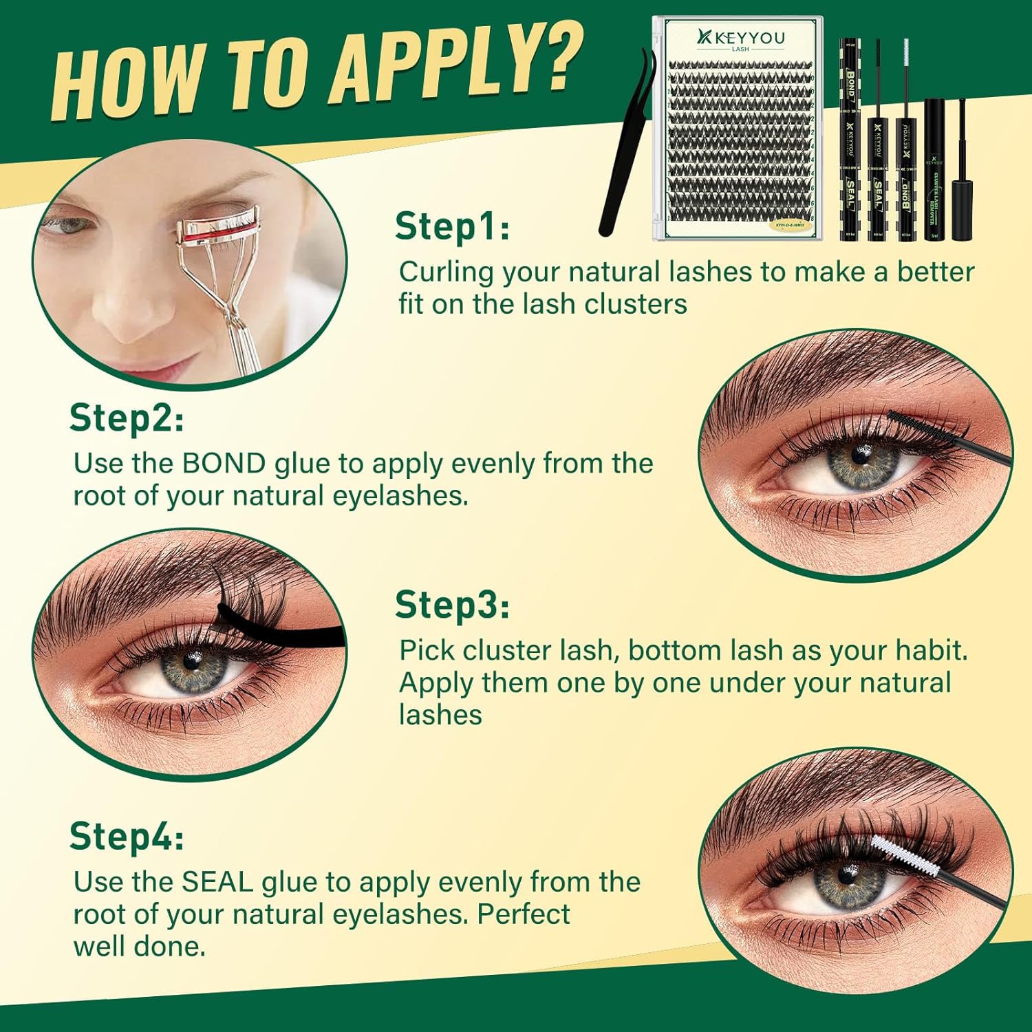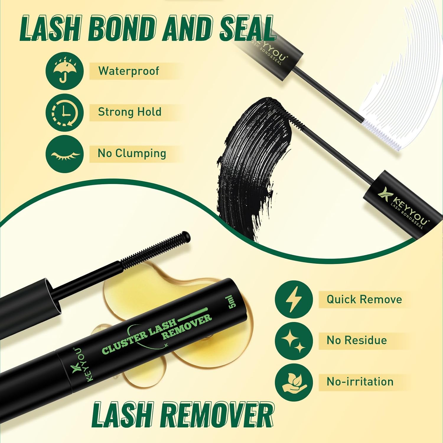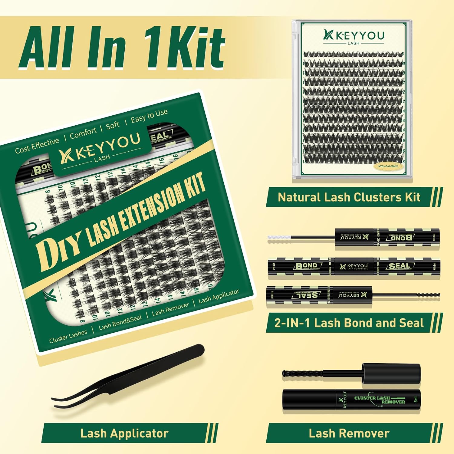 KEYYOULASH Lash Clusters Kit Thick 120pcs 8-18MIX Lash Extension Kit Volume Lash Clusters with Bond and Seal,Remover,Applicators for DIY Eyelash Clusters at Home (KY01 Kit)