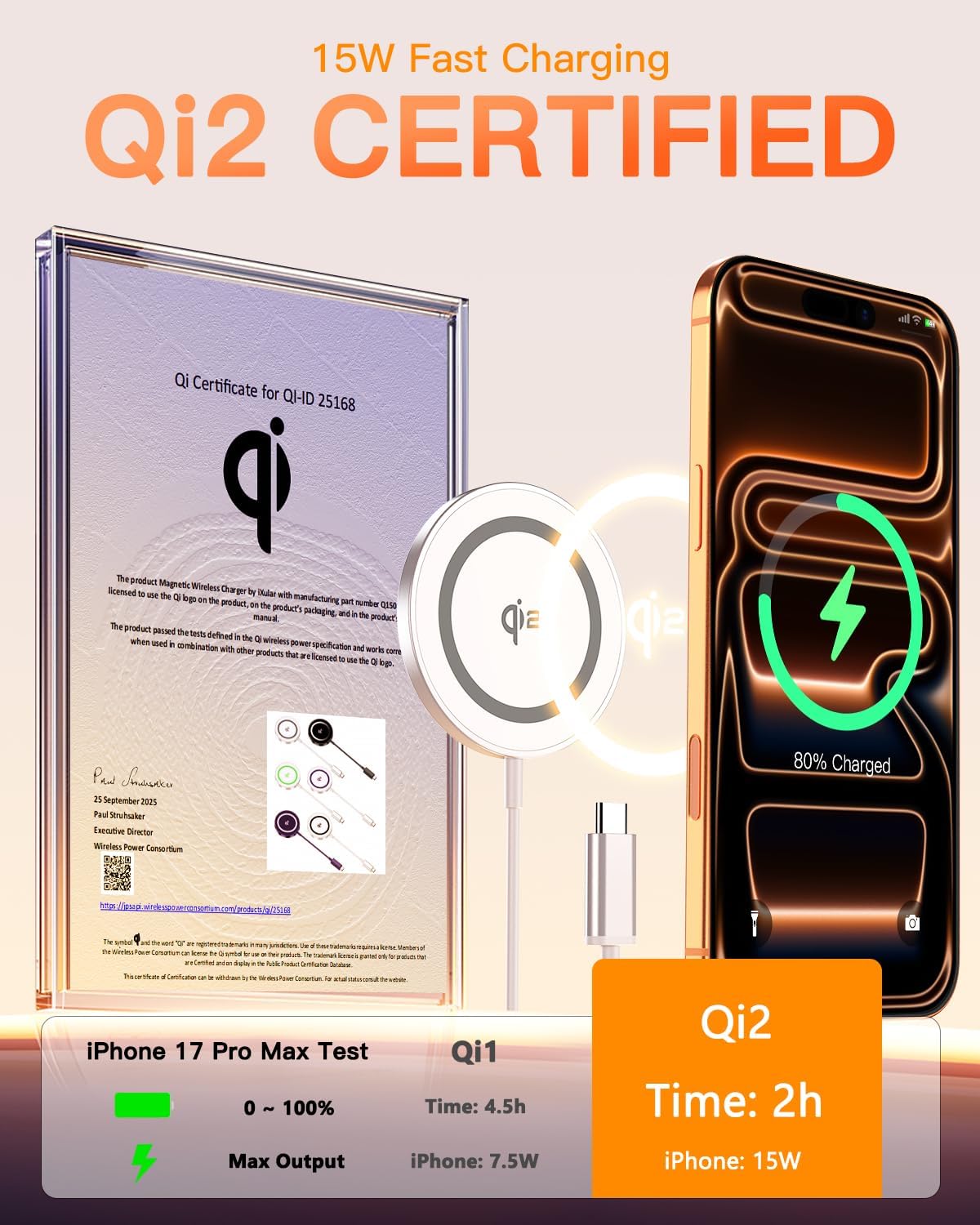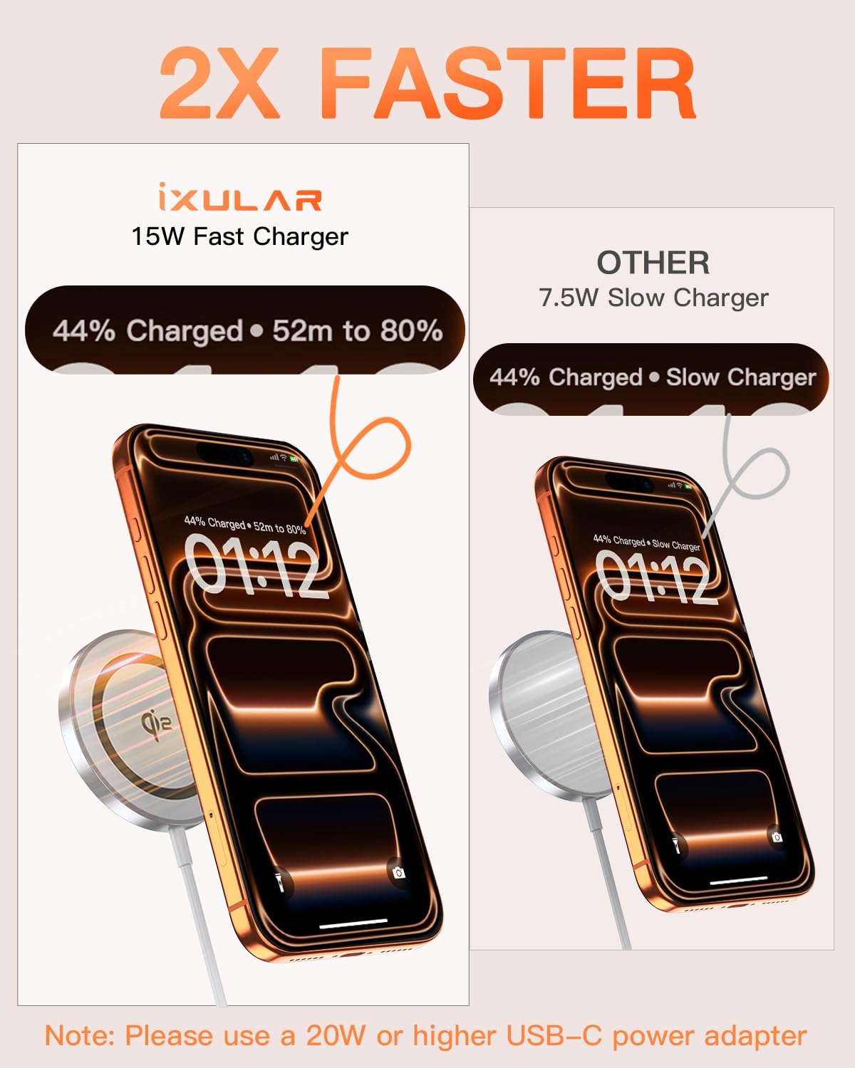 The Qi2 certified magnetic charger delivers up to fifteen watts of fast charging power, which is twice as fast as standard seven point five watt chargers. This advanced technology can charge your device to twenty two percent in just twenty minutes and reach a full charge in approximately two hours. For optimal performance, please use a twenty watt or higher USB C power adapter. Please be aware that the power adapter is sold separately.
