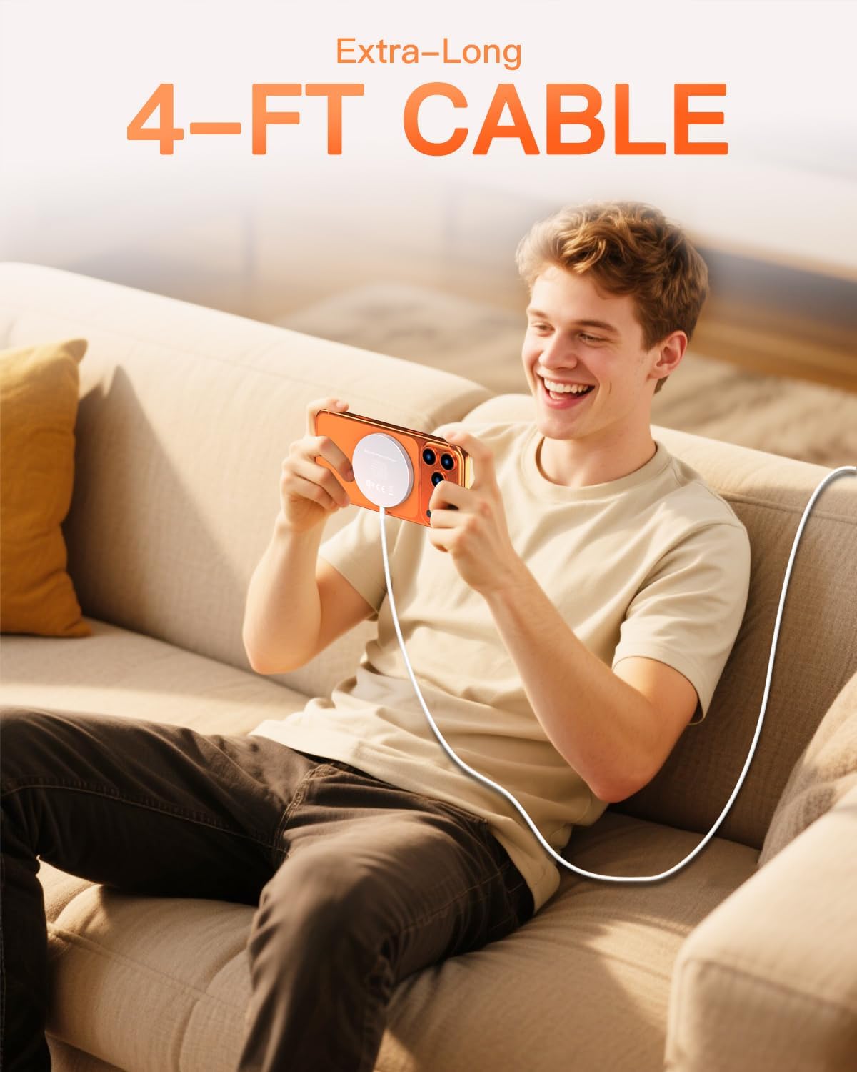 Every charger includes a four foot cable that combines flexibility with long lasting durability. This extended length allows you to use your phone comfortably at your desk, by your bedside, or on the sofa while it stays connected to power. The extra reach provides the freedom to move without being tethered too closely to the wall outlet.