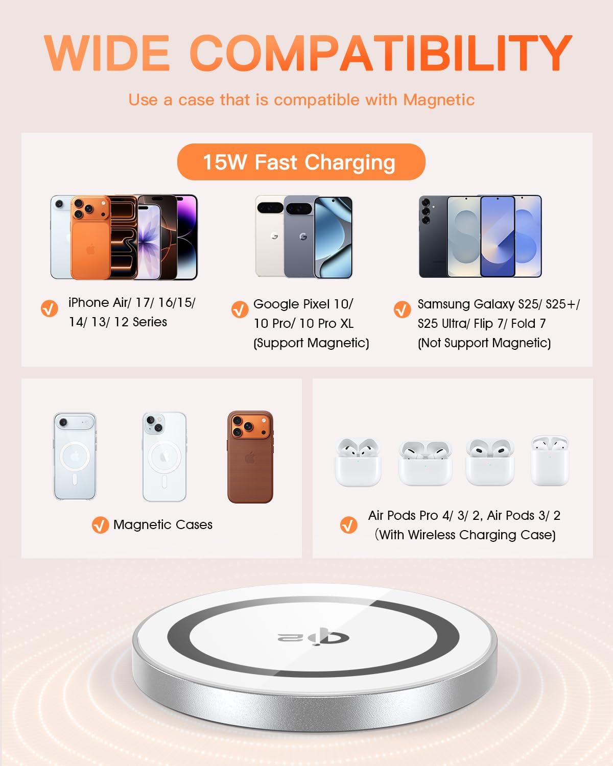 This magnetic charger is compatible with a wide range of devices, including the iPhone 12 through the iPhone 17 series and various AirPods models. It also supports fast charging for the Pixel 10 series and the Samsung Galaxy S25 line, though please note that some models may not support the magnetic attachment feature. For the best experience, we recommend using a case specifically designed for magnetic charging.