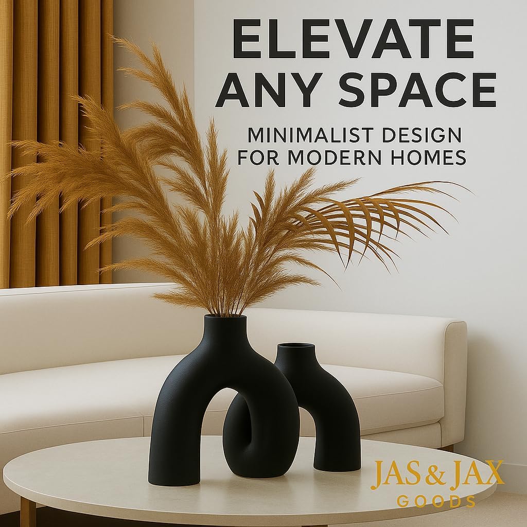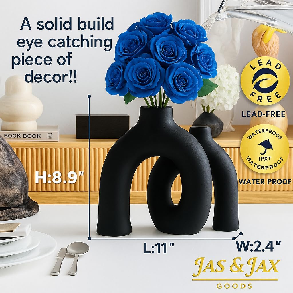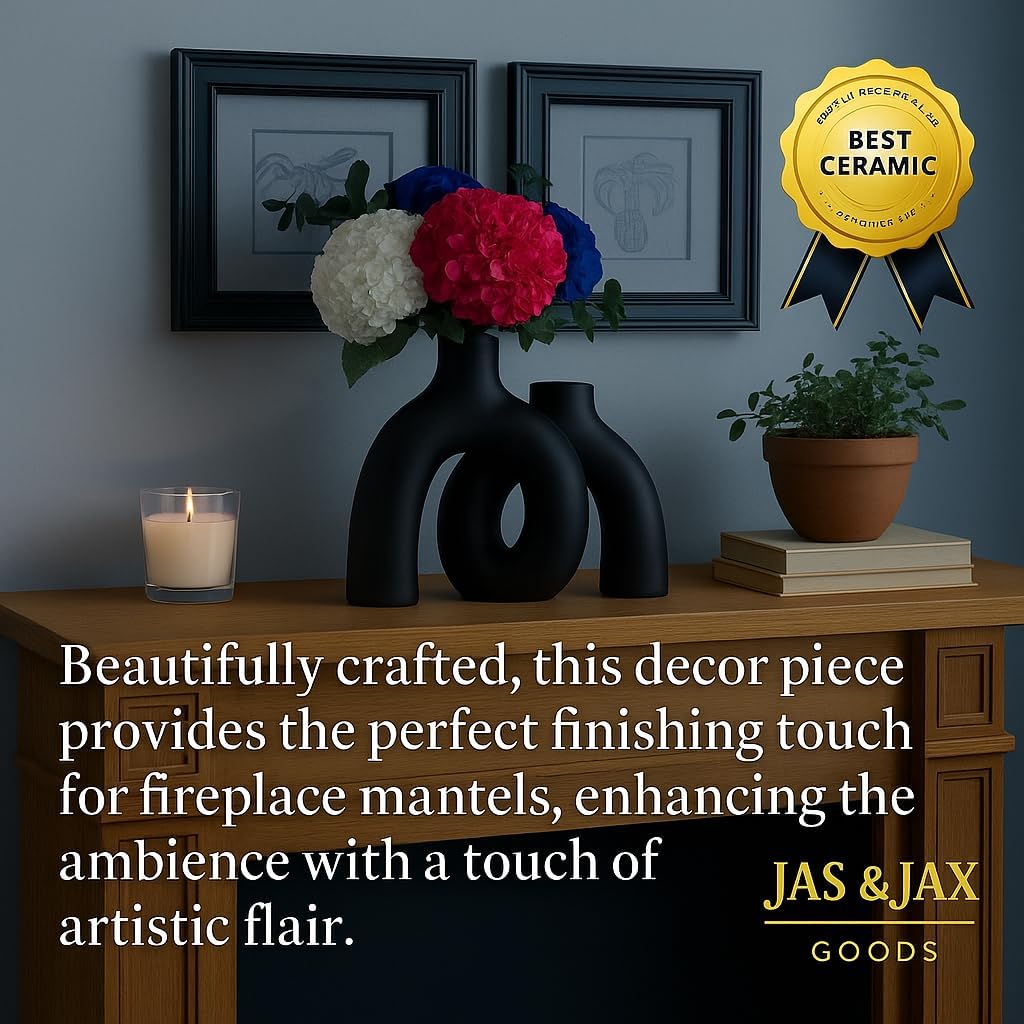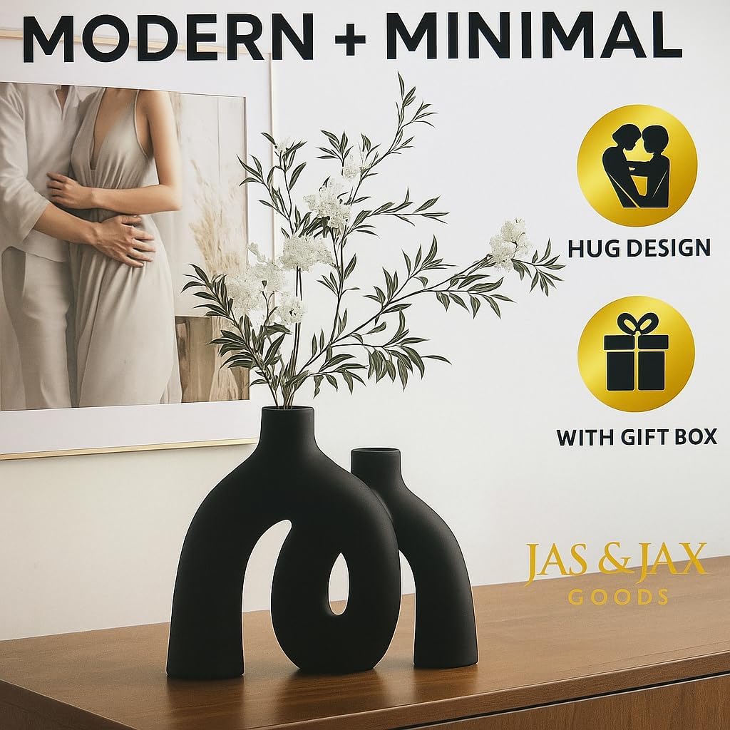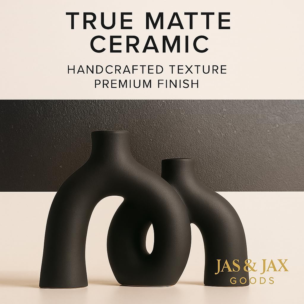 Matte Black Ceramic Vase Set - Modern Hug Donut Ceramic Vases by JAS & JAX GOODS, Minimalistic Nordic Home Decor Centerpiece for Console Tables, Living Room, Bookshelf, or Fireplace Mantel