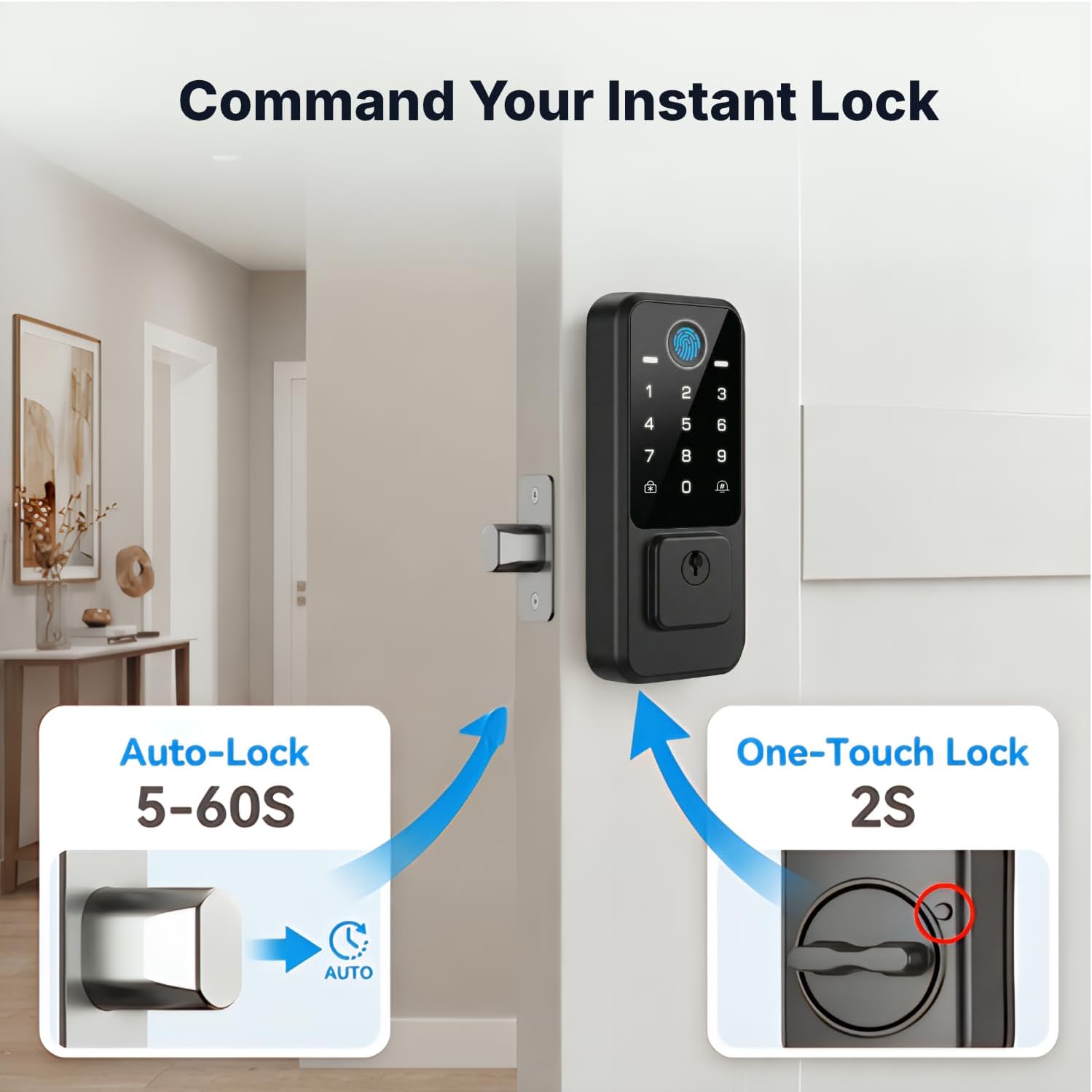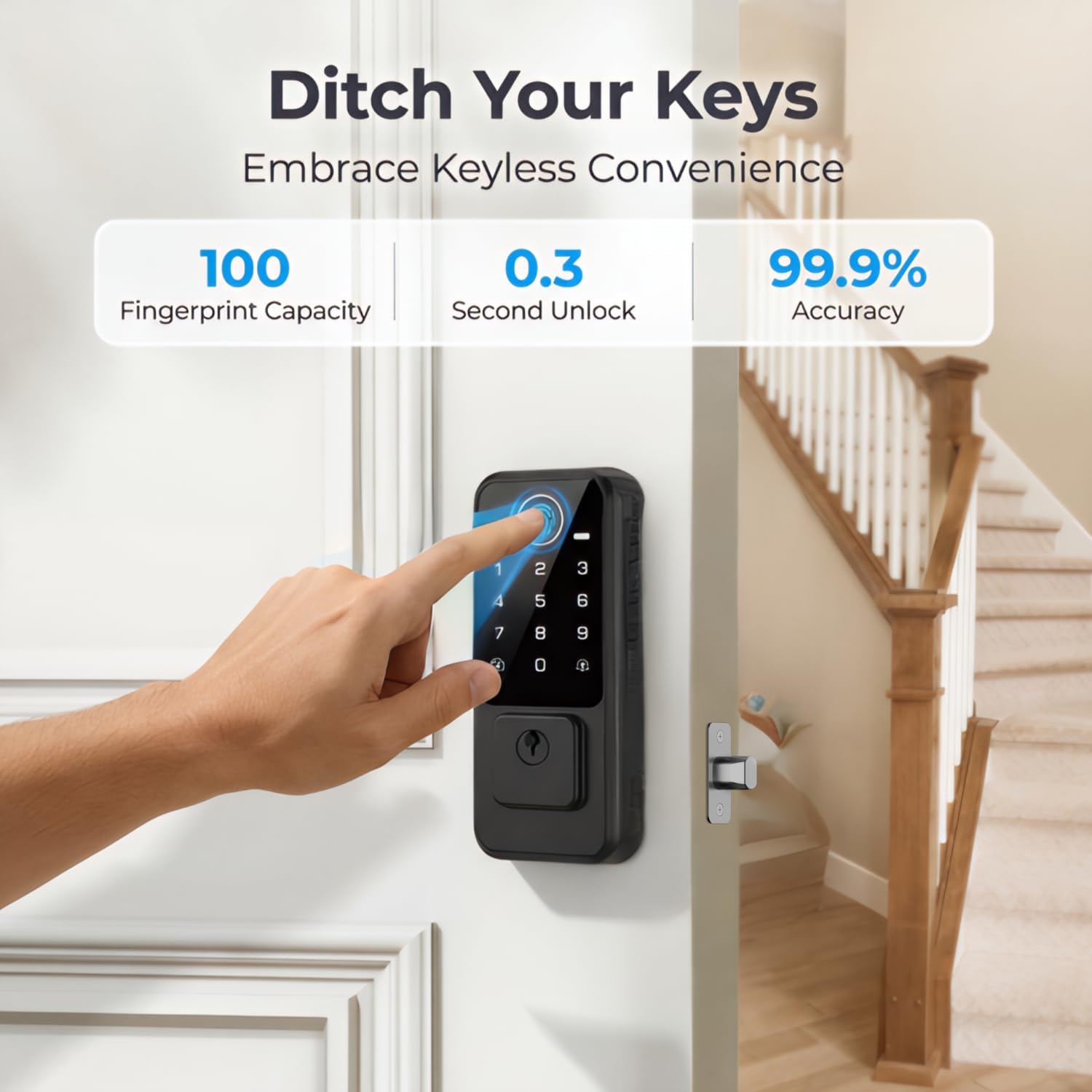 Experience lightning fast entry with an advanced fingerprint sensor that recognizes your print in just zero point three seconds. With a high recognition rate of ninety nine percent this system is much faster and more secure than searching for traditional keys.