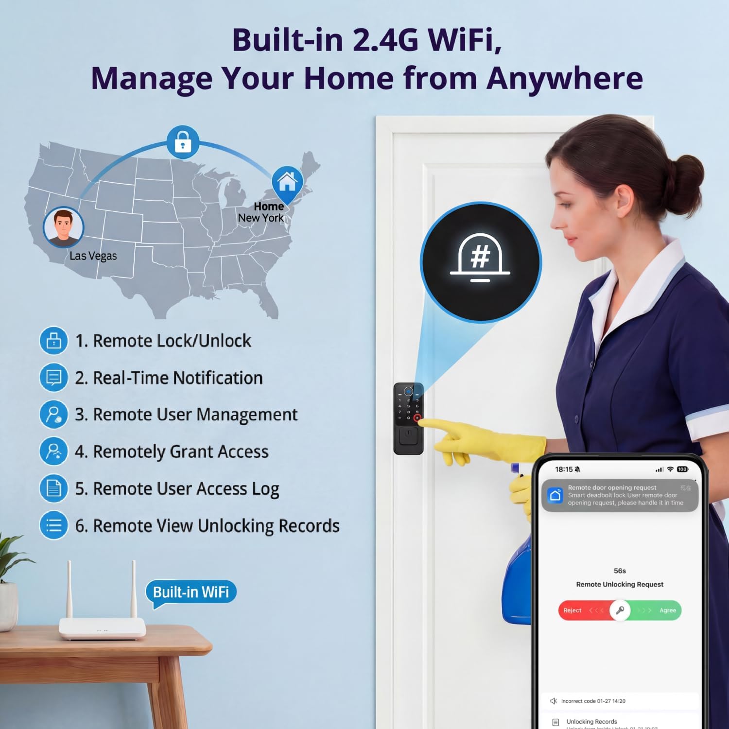 Control your front door locks remotely from anywhere. Whether you are at work or traveling you can manage your lock status directly from your smartphone without the need for an extra gateway or hub.