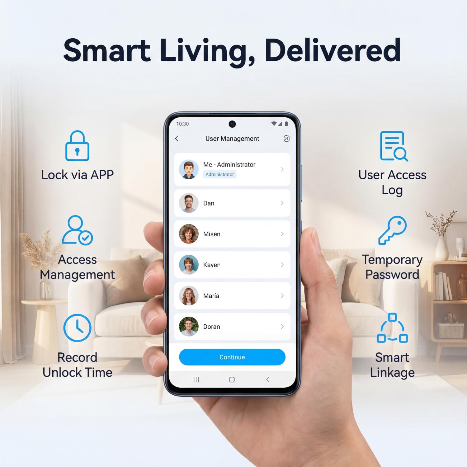 Grant secure entry to family friends and service providers through your phone. The door lock stores one hundred fingerprints and one hundred PIN codes allowing you to create and share temporary or permanent access rights. This makes it a perfect solution for homes rentals businesses and hospitality management.