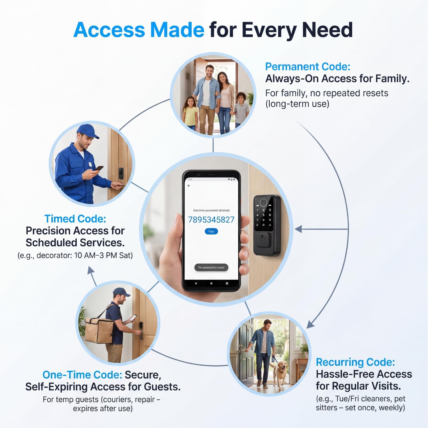 Create unique one time passcodes for temporary visitors or deliveries. This feature makes it easy to manage keyless entry while maintaining high security for your property.