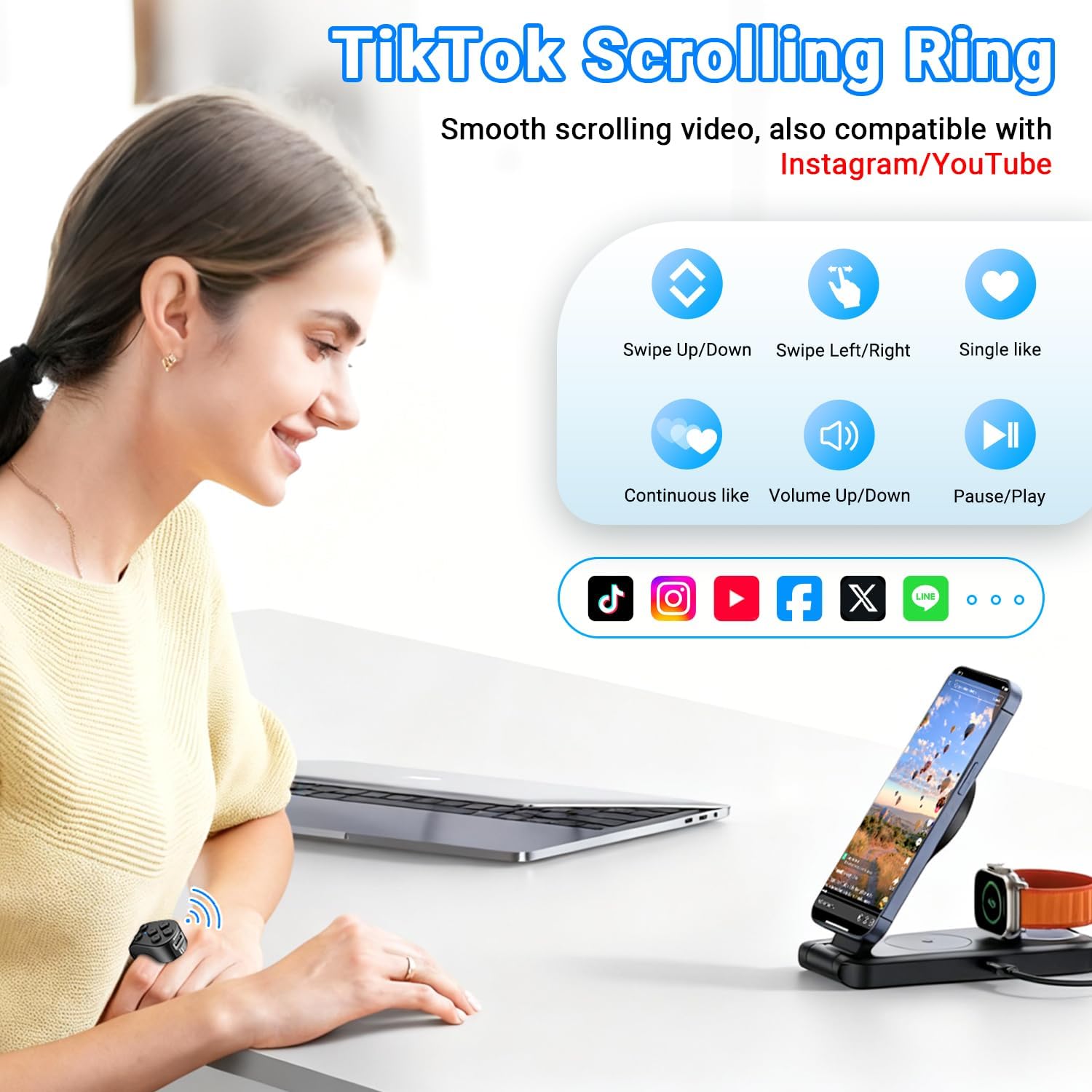 The TikTok Scrolling Ring allows you to control your feed remotely. You can scroll up and down, switch left and right, and pause or play videos. It also supports likes, continuous likes, and volume adjustments so you can enjoy content without touching the screen. This essential tool is also compatible with YouTube and Instagram for a more comprehensive browsing experience.