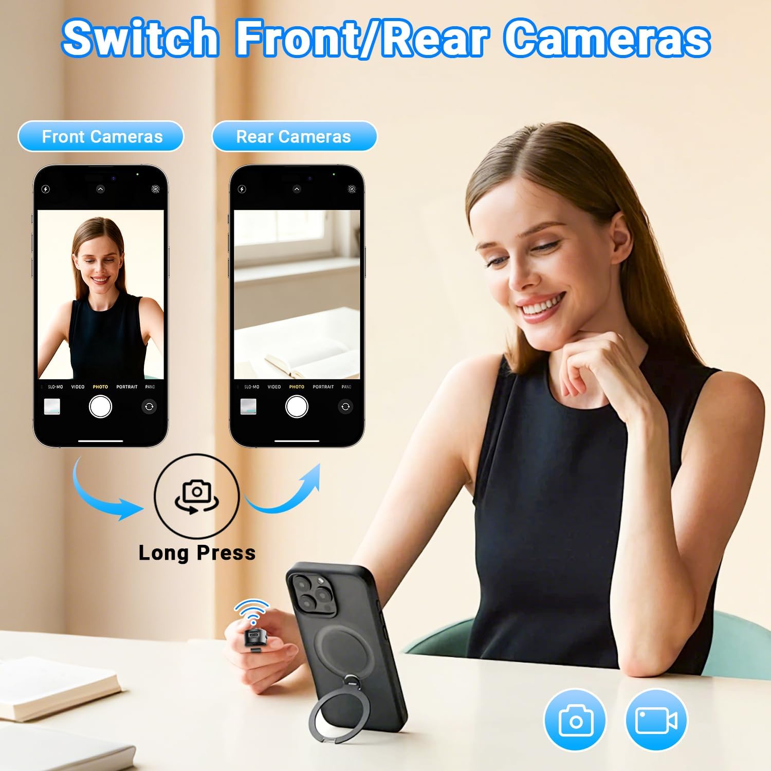 This camera remote ring works with native cameras, beauty apps, and short video cameras. It supports remote shooting, burst photos, switching between front and rear cameras, and focus functions. It is lightweight and portable, making it an ideal choice for selfies, group photos, and content creation.