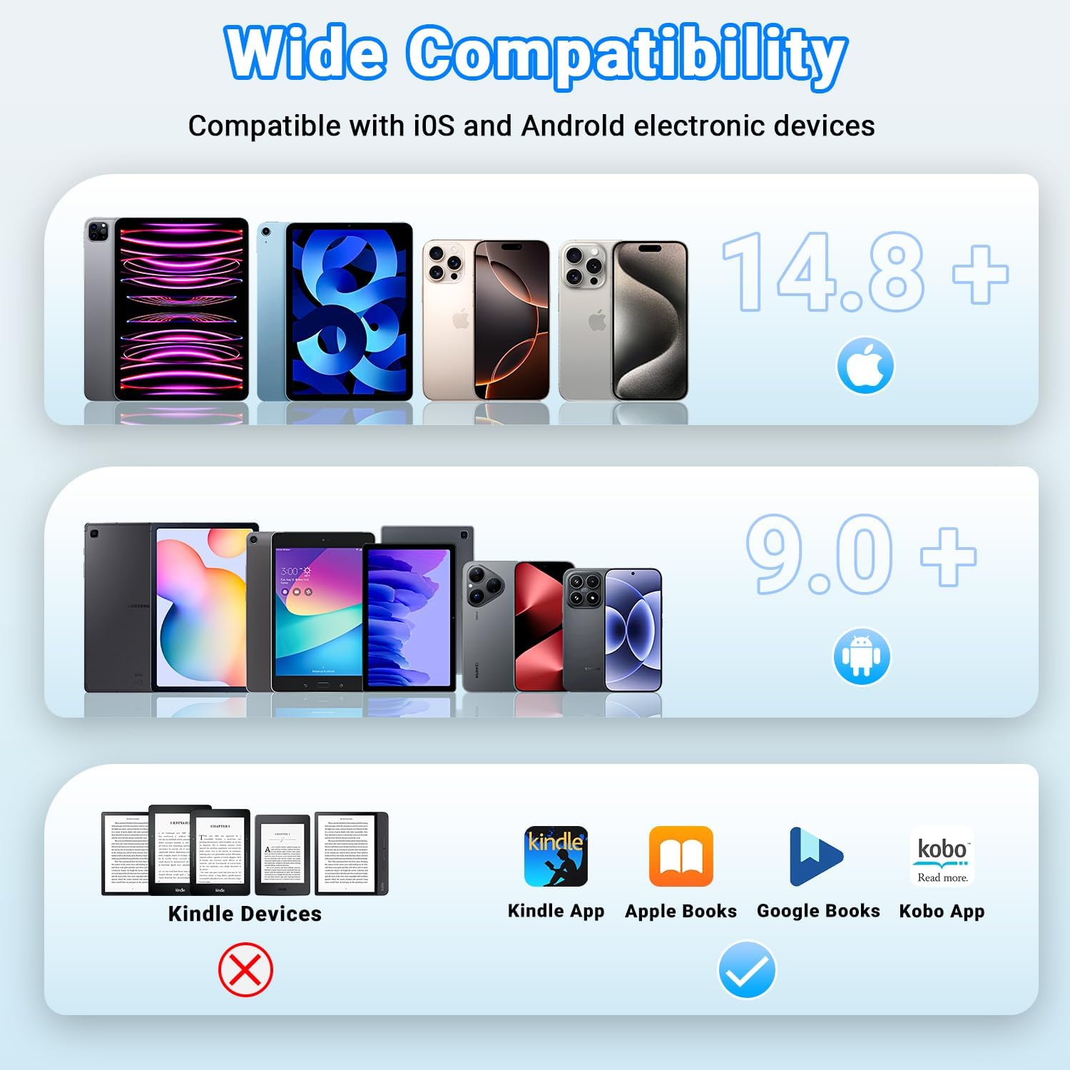 The phone scrolling ring supports smartphones and tablets running iOS 14.8 and above or Android 8.0 and above. The page turning and video control functions are compatible with most mainstream apps to meet your daily needs. Again, please remember this device is not compatible with physical Kindle hardware.