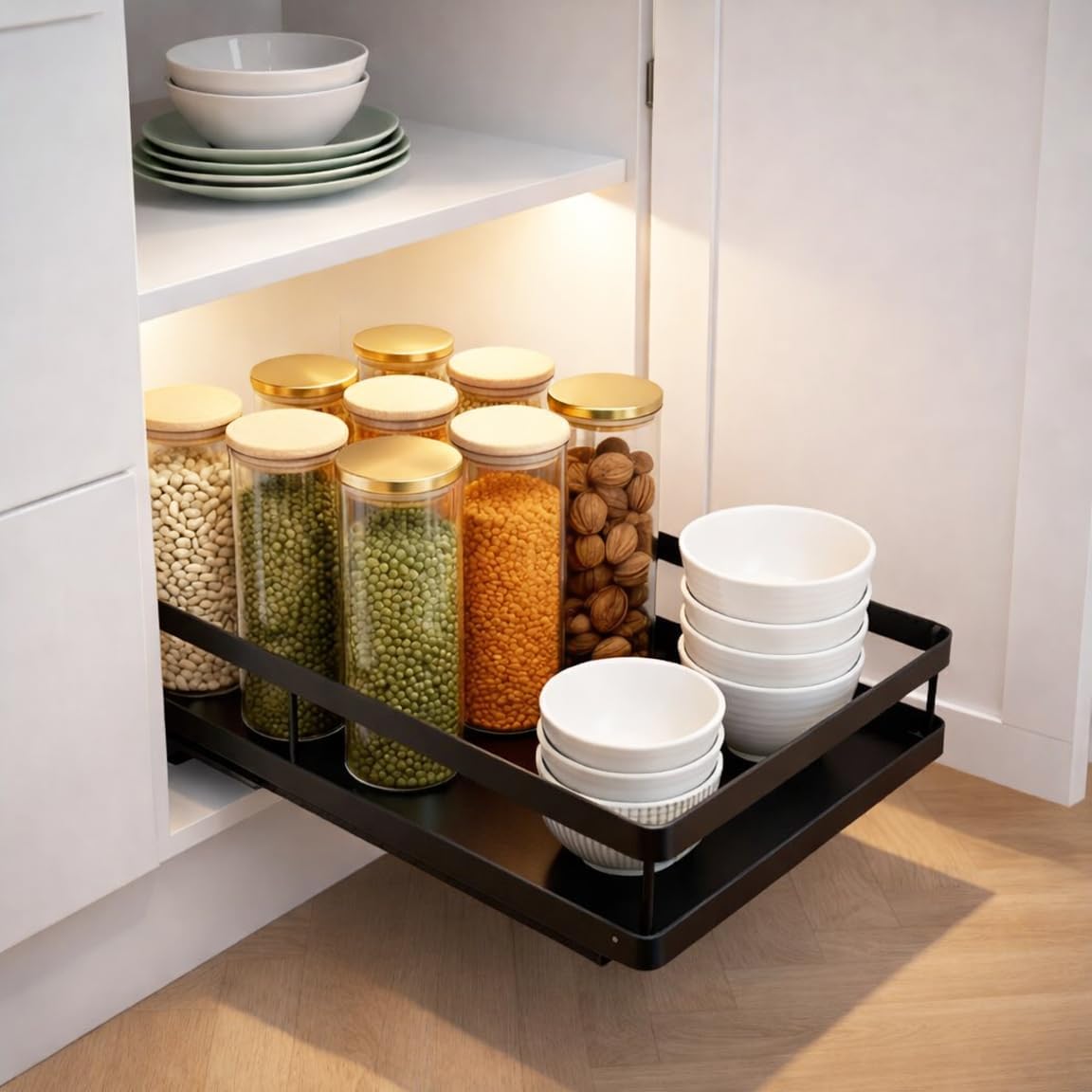 Experience effortless access with dual-rail ball-bearing slides that ensure a quiet, jam-free glide. The slide-out drawers function as a superior pull-out cabinet organizer, bringing every item to the front for fast access.