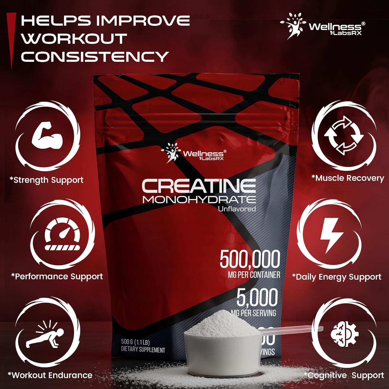 WELLNESS LABSRX Creatine Monohydrate Powder 500g – 100 Servings Micronized Creatine Powder Supplement, Unflavored Creatine for Women and Men, Supports Muscle Strength, Energy, Endurance and Workout